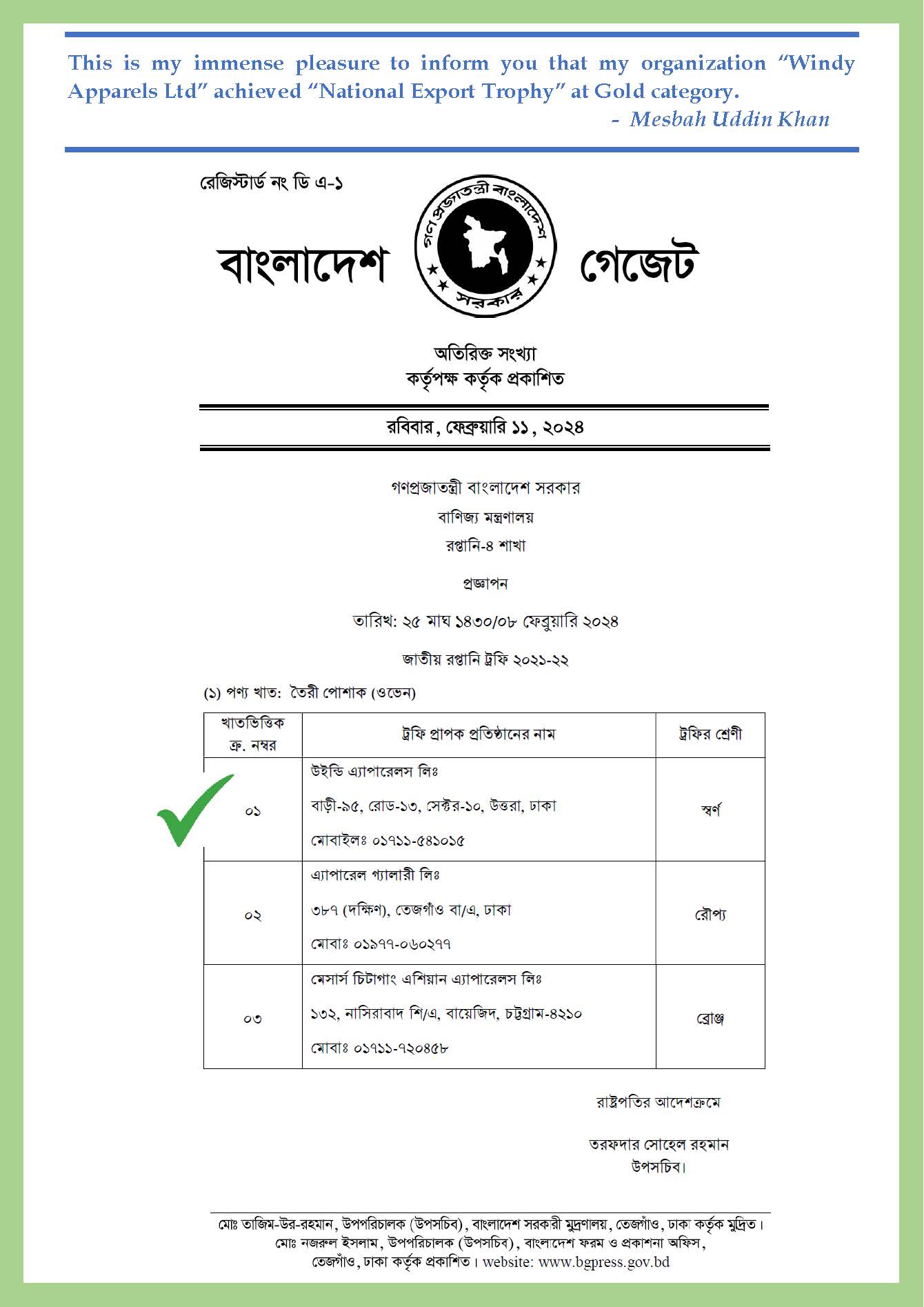 National Export Trophy 2021-22 winner at Gold category